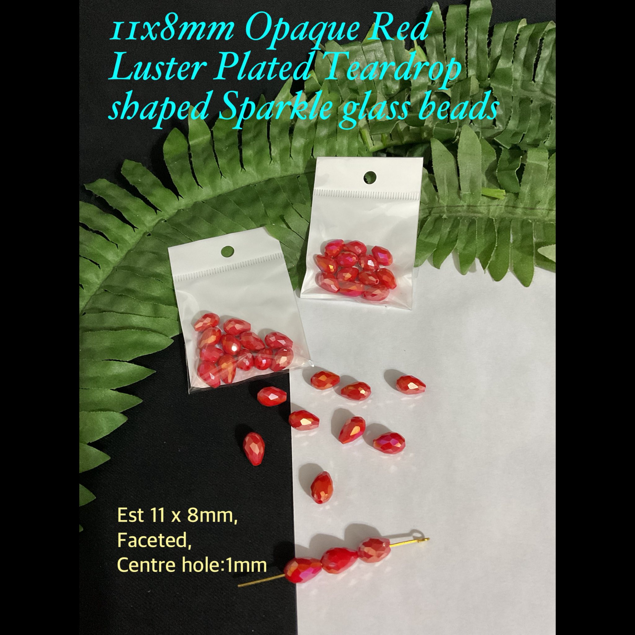 11x8mm Opaque Red Luster Plated Teardrop shaped Sparkle glass beads (12pcs)