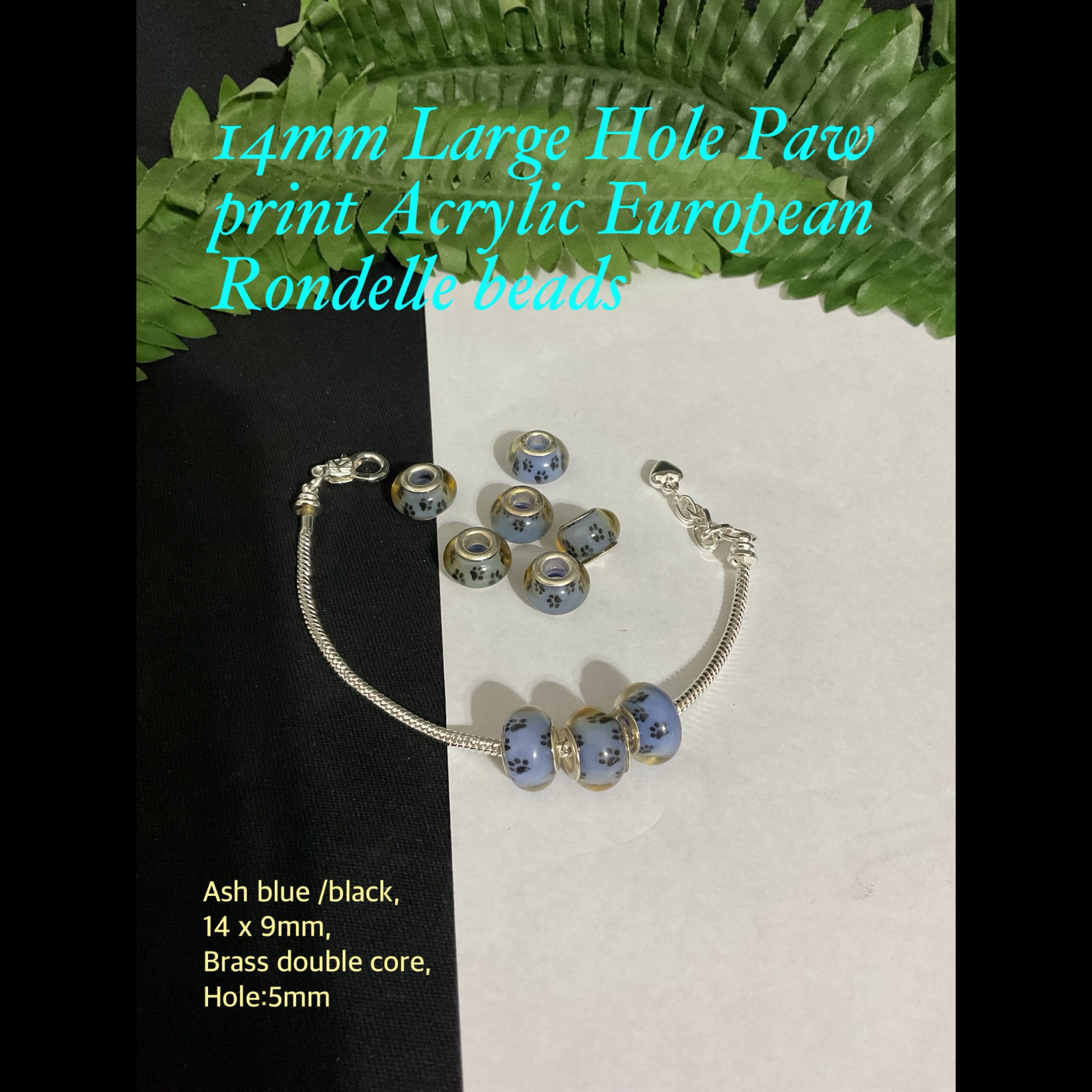 14mm Large Hole paw Print Acrylic European Rondelle beads (Ash blue/black)