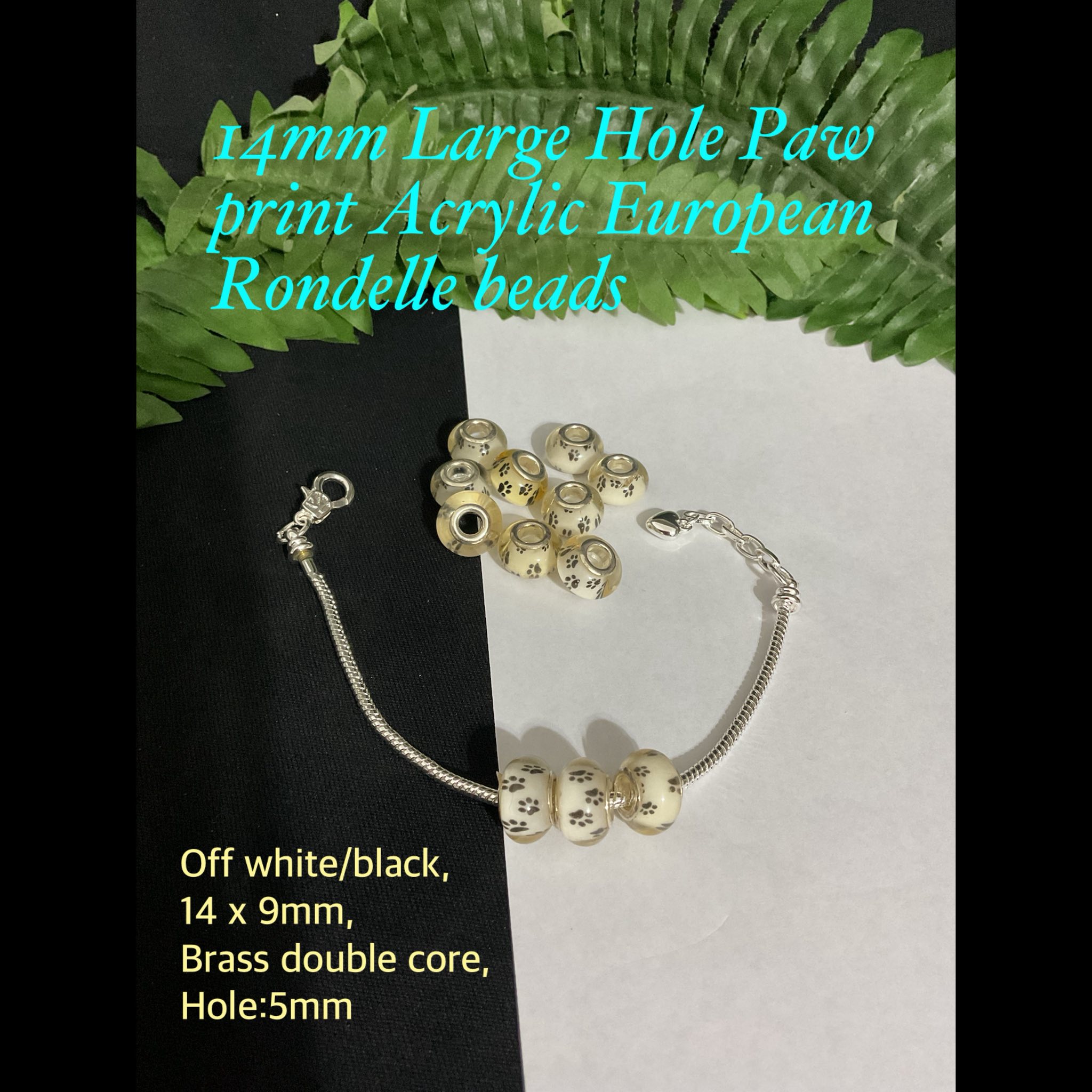14mm Large Hole paw Print Acrylic European Rondelle beads (off white/black)