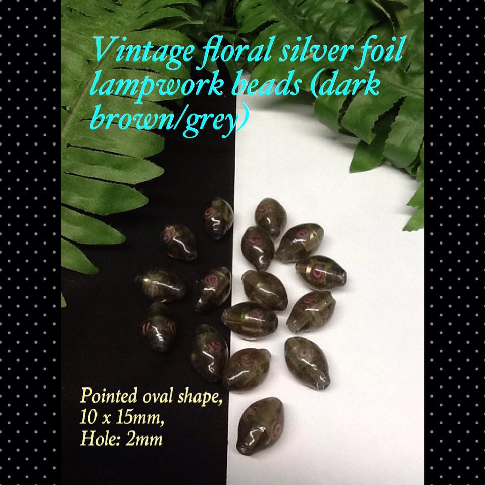 15mm Brown/Grey Vintage Floral Silver foil Lamp work glass beads (10pcs)