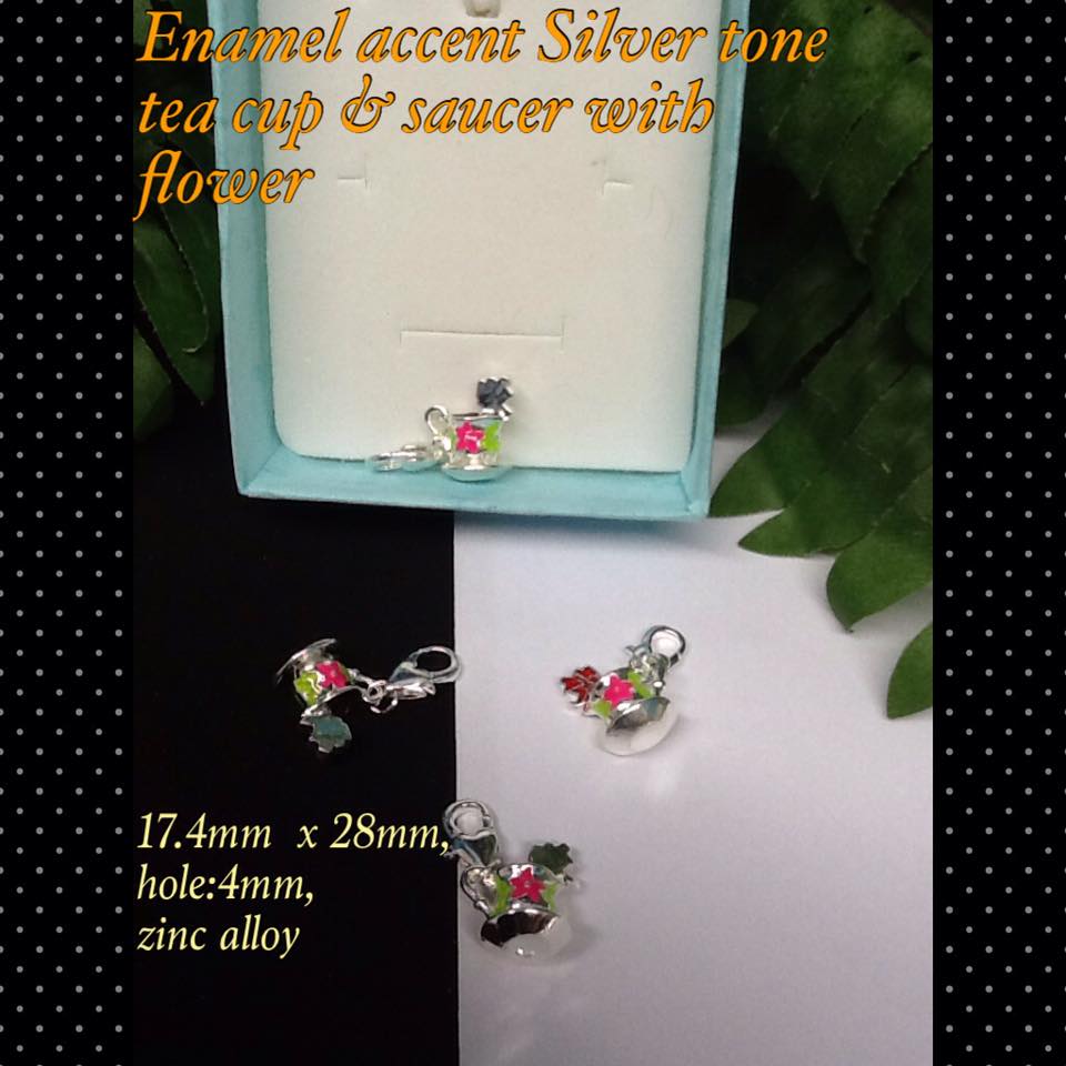 17.4mm Enamel accent silver tone tea cup/ saucer with flower/lobster clasp