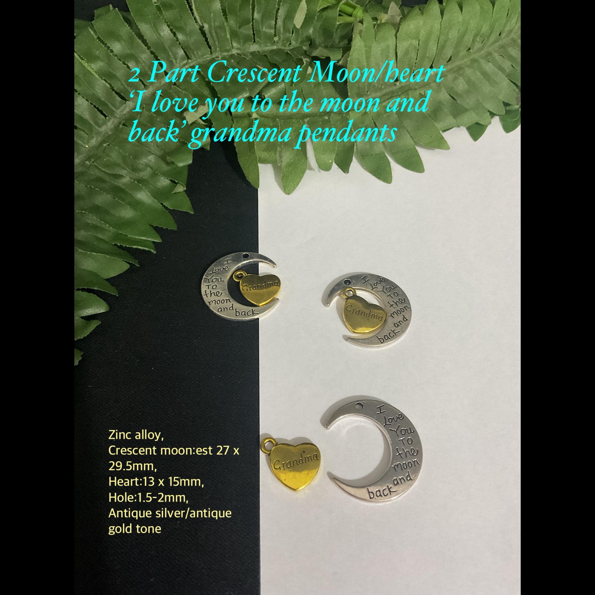 2Part Crescent moon/heart ‘I love you to the moon and back ‘ grandma pendants (antique gold)