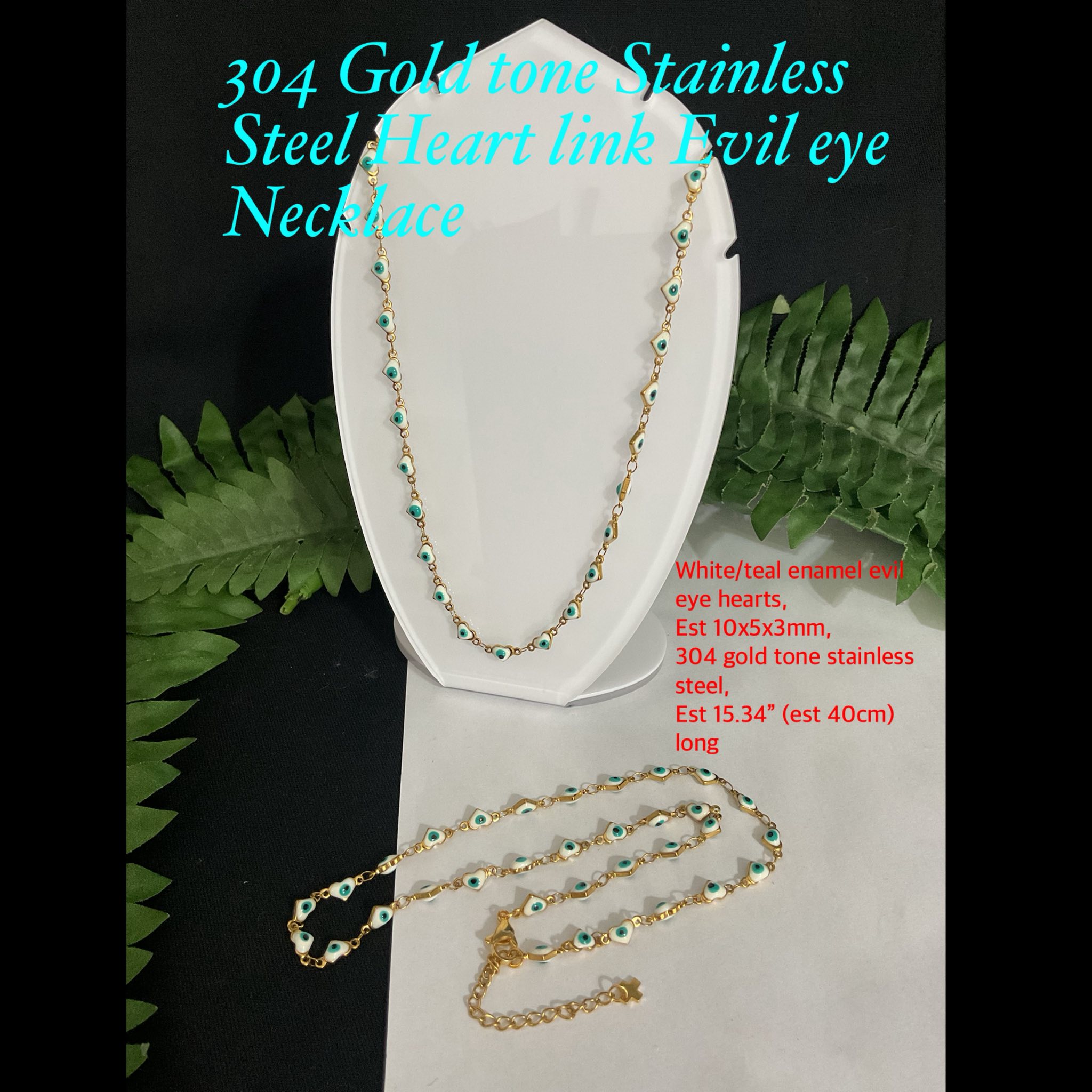 white/teal enamel evil eye hearts, est 10x5x3mm, est 15.34″ (est 40cm long) with 5cm extender