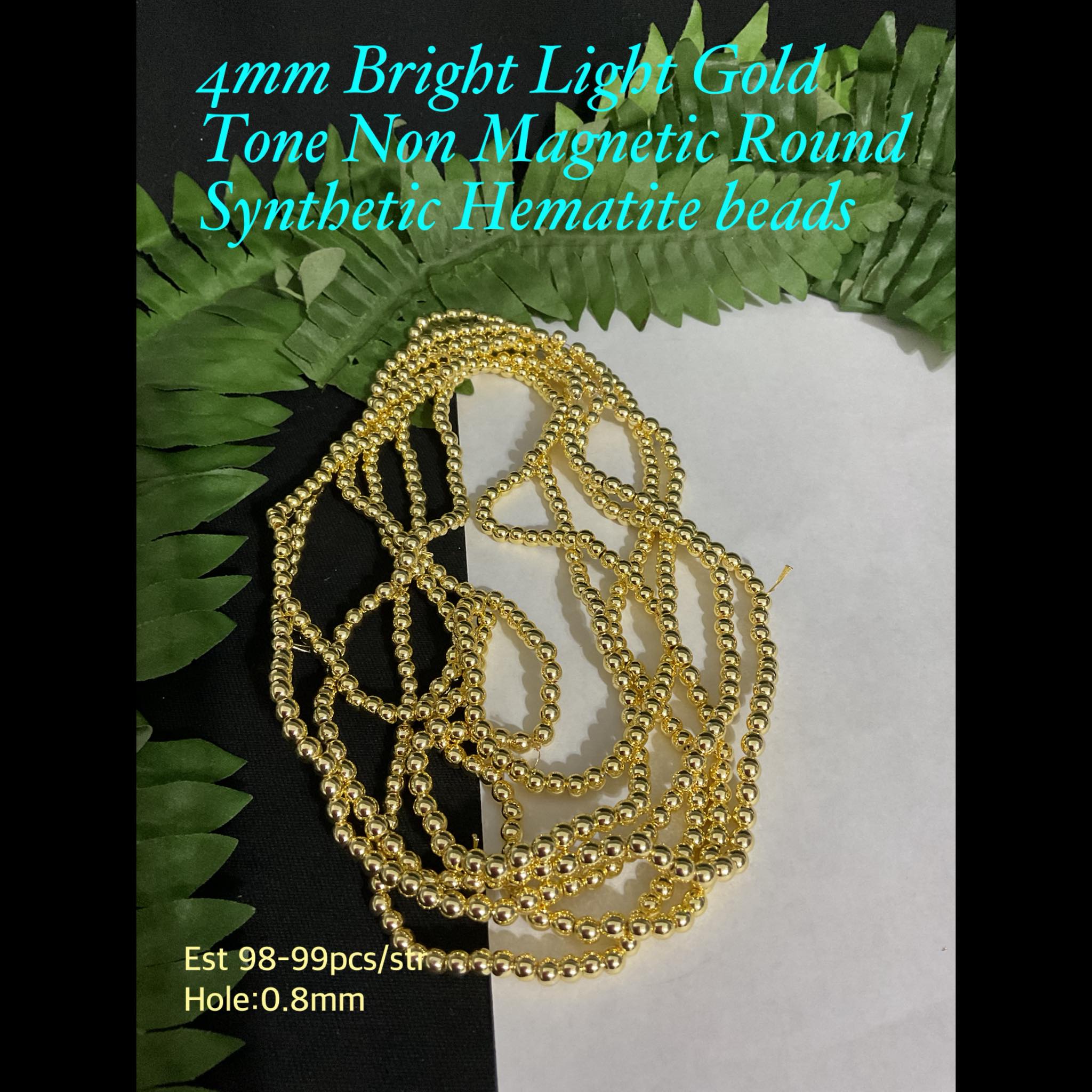 4mm Bright Light gold tone non-magnetic synthetic Hematite round beads (est 98-99pcs)