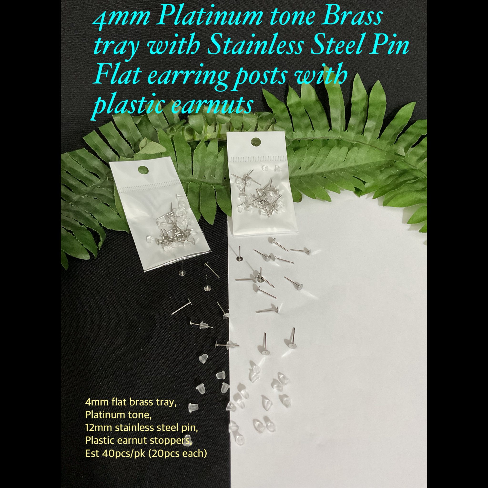 4mm Platinum tone Brass tray with Stainless Steel pin Flat earring posts with plastic earnuts (est 40pcs)