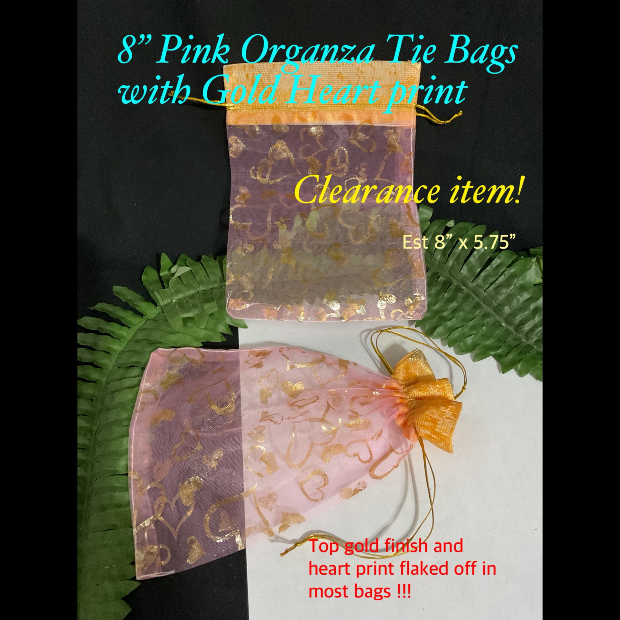 8″ Pink Organza Tie Bags with Gold heart print (est 20pcs)